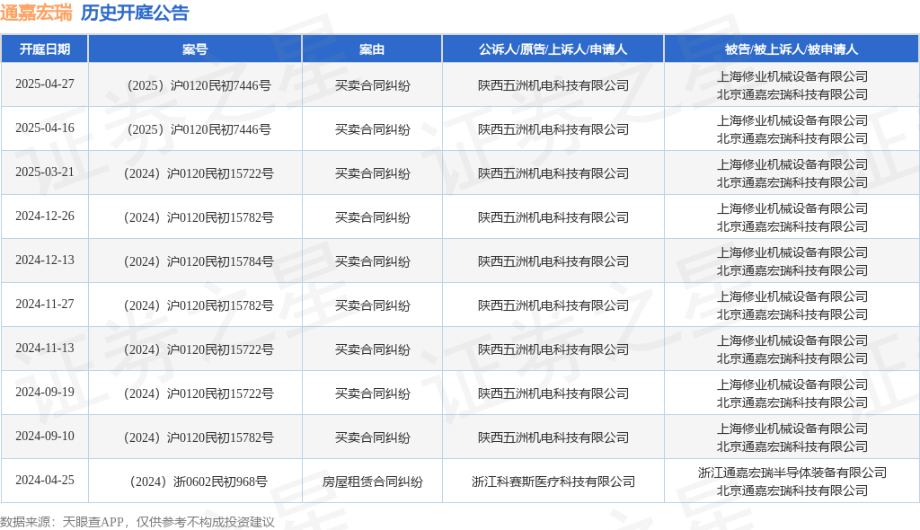 案号:(2025)沪0120民初7446号审理法院:上海市奉贤区人民法院案由:买卖合同纠纷当事人信息: 原告/上诉人:陕西五洲机电科技有限公司 被告/被上诉人:上海修业机械设备有限公司、北京通嘉宏瑞科技有限公司开庭日期:2025年4月27日根据统计,近一年内以北京通嘉宏瑞科技有限公司为当事人的历史开庭公告有10则,其中案由为“买卖合同纠纷”的公告以9则居首,其次为“房屋租赁合同纠纷”有1则。历史开庭公告如下: