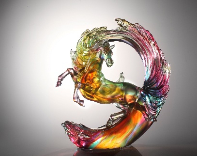 《信念》所呈现的这匹马倾斜接近40度,整体打造了骏马奔跃在蓝绿山峦的场景。这件作品的最大特色,在于马匹的颜色,从马头到尾巴是浓紫到淡紫、淡紫到透明的“渐变色”,这意味着烧制过程中需要极其精准地“控温”。杨惠姗介绍,《信念》烧制过程需要12次以上的控温观察,保证温度在789到803摄氏度之间财富家,否则就会“串色”。