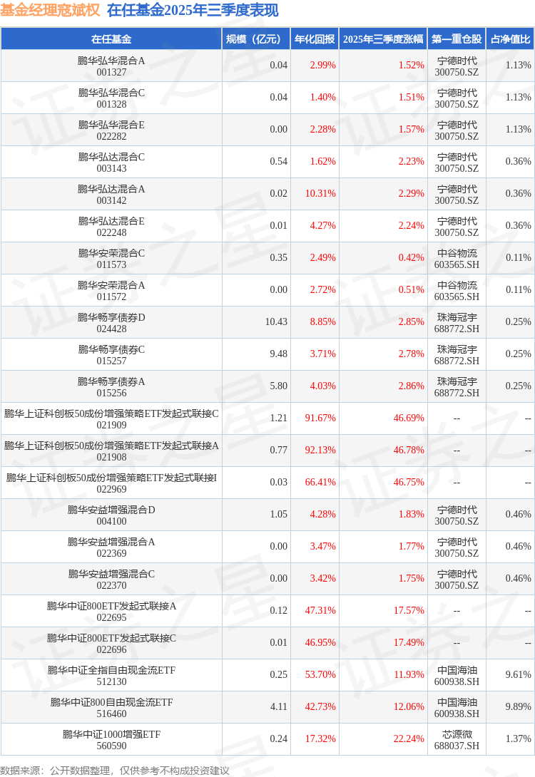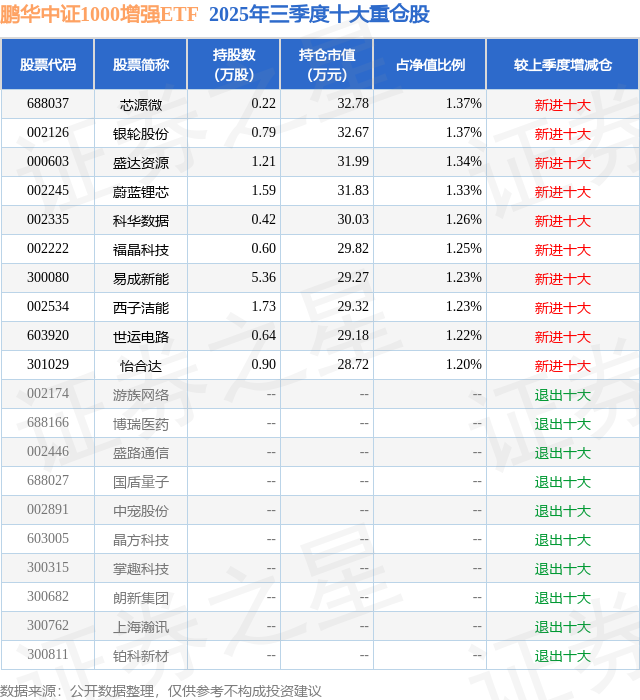 从基金规模来看,鹏华中证1000增强ETF基金2025年三季度公布的基金规模为0.24亿元牛掌柜,较上一期规模1601.87万元变化了784.65万元,环比变化了48.98%。该基金最新一期资产配置为:股票占净值比96.39%,无债券类资产,现金占净值比3.69%。从基金持仓来看,该基金当季前十大股票仓位达12.8%,第一大重仓股为芯源微(688037),持仓占比为1.37%。
