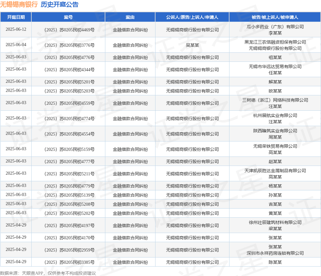 案号:(2025)苏0205民初4284号审理法院:无锡市锡山区人民法院案由:金融借款合同纠纷当事人信息: 原告/上诉人:无锡锡商银行股份有限公司 被告/被上诉人:曲周县翔能包装制品有限公司、白某某开庭日期:2025年4月27日根据统计,近一年内以无锡锡商银行股份有限公司为当事人的历史开庭公告有424则,其中案由为“金融借款合同纠纷”的公告以416则居首,其次为“借款”有3则,“借款合同纠纷”有3则。历史开庭公告(前20条)如下:
